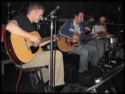 | 21 Uhr 40 schrammelten UNIVISION zwei Nummern lang da weiter, wo die Kinder zuvor endeten. Doch es wurde besser. Denn ab Lied Nummer drei wandelten die Frankfurter in sehr eindringlichen Emo-Rock-Gefilden. Patrick, Moritz und die beiden Christians öffneten Räume zum Träumen. „My Sunday Afternoon Tea Party“ war ein unglaublich schöner Gitarrenrocker über traurige Sonntage. Vorgetragen einzig von Patricks und Christians treibenden Instrumenten und erdigen Stimmen. Feine Echoeffekte sorgten für Gänsehautstimmung. Mit „Destroy the World“ folgte ein Finsterling, den uniVision erst zwei Tage zuvor fertig hatten. Darauf wurden beim Titelstück der Schallrille, „Risk a View Down“, die Pedale wieder etwas fester durchgetreten. Das folgende „So Unhappy“ begann sehr ruhig und mündete in einem kraftvollen Gitarrensturm. Während „The World is Not Included“ und „Where are You?“ einfach nur schöne Gefühlsrocker voller grüblerischer Melancholie waren. Wenngleich auch uniVision nicht ohne neunmalkluge Einwürfe auskamen, sorgten sie zumindest für ein bißchen Wohligkeit in dieser kalten Jahresendzeit. | ||||||||||||||||||||||||||||||||||||||||||||||||||||||||||||