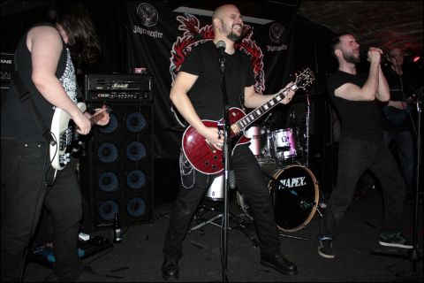 | Mit Miguel Santos und Kaivan Saraei hatten A DREAM OF POE zwei Auswanderer, die sich vom Doom verzaubern ließen, und fern der Heimat (Santos stammt von den Azoren!) für ihre Träume kämpfen. Melodischer Death Doom ist der bevorzugte Stil, und „Metal“ hatte der Frontmann unmittelbar vorm Auftritt versprochen. Viel mehr war nicht bekannt. Alle waren gespannt, wie sich Santos, Saraei, Skirving, Cameron und McPherson präsentieren würden. Voller Melancholie und fragiler Düsternis klangen die Apparillos. Die Texte trieften nur so vor epischer Tragik. Alles war mit viel Herzblut gemacht. Doch im Mittelteil leierte der Grundton ein bißchen und drohte in Verbindung mit dem zuckerig-sonoren Gesang ins Melodramatische abzugleiten... bis Sir Lord Santos erstmals im Leben live das Mikro ergriff - und seinem Rudel mehrere Moll tiefer eine neue Richtung gab. A Dream of Poe waren etwas zum Mitleiden. Das anrührende Meisterstück „Lady of Shalott“, die gutturalen Vokale des unentwegt über die Planken rochierenden Santos, und gewisse Details wie der Eisenschmuck und die schwarz lackierten Fingernägel von ebenjenem, retteten die Schau. An das wuchtig-lyrische Erstlingswerk 'The Mirror of Deliverance' von 2011 reichten A Dream of Poe in der Bühnenbesetzung aber nicht ganz heran. | ||||||||||||||||||||||||||||||||||||||||||||||||||||||||||||