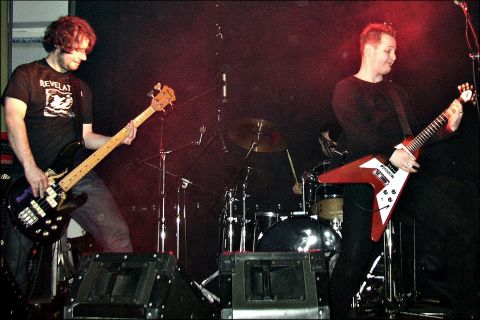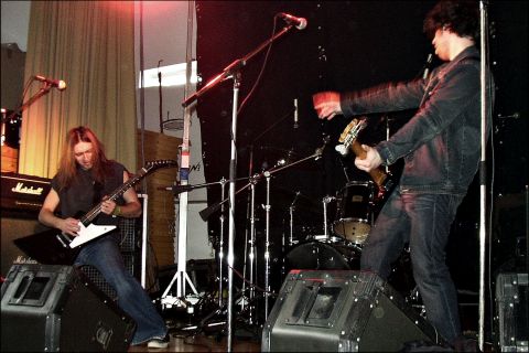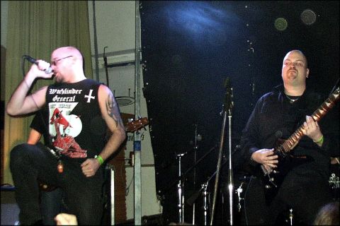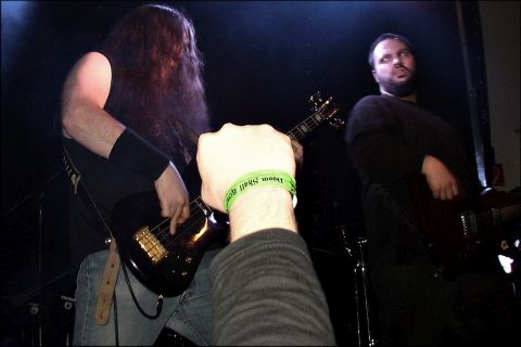 REVEREND BIZARRE ließen von 23.30 bis 0.25 die Zeit still stehen. Magister Albert, Peter Vicar und der Earl of Void aus dem finnischen Lohja waren die Radikalsten. Die drei stehen auf Kruzifixe, Thorshämmer und Patronengürtel, und verkörpern die Codes bis zum Gehtnichtmehr. Ihr Doom ist die sarkastischste Agonie und Misanthropie die man sich überhaupt vorstellen kann. Fopp verriet mir, daß Rev. Bizarre eine der Gruppen sei, wo alle Mitglieder nicht bloß etwas vorgeben, sondern die Musik wirklich leben. Schade, daß ich nur die wenigen Proben im Netz kannte. Und dabei haben die Nordmänner solch ein suizides Fluidum verströmt. Mit „Doom Over the World“ fing ja alles noch leidlich entspannt an... Doch schon beim zynischen Malmer „In the Rectory“ flossen acht Minuten lang nur verstörende Fragmente von Tönen... dann eine zweiminütige Eruption... um schließlich zum am Stillstand zelebrierten und auf Unheil reduzierten Doom zurückzukehren. Die obskure Hymne „Doomsower“ schloß sich an. Wobei Rev. Bizarre nicht nur wahnsinnig eindringlich, sondern auch HEAVY wie ein Panzer daherkamen. Ein Slowbanger von 40 Grad unter Null - die viertelstündige Klagezeremonie „Hour of Death“ - folgte. Reverend Bizarre sind tödlich für labile Seelen. So starrte der Magister immer wieder in meine Augen und erzeugte so einen irritierenden Effekt. Oder war das Satan persönlich? Höllenbeschwörung war es allemal. Anflehungen von einem dunklen Ort, stinkender Schwefel, brodelnder Teer, siedendes Pech: Wenn das jemand ist, dann Reverend Bizarre! Der „Fucking Wizard“ schließlich, ein Haß speiendes Ungeheuer, das erst nach 13 Minuten mit ´nem sabbathschen Riff für Aufatmen sorgte, bedeutete die finale Auslöschung alles Irdischem. Fünf Stücke in einer Stunde lassen die Schwere wohl erahnen. Leider hatte der Magister von Beginn an Schwierigkeiten mit der Ausrüstung. Dies lag erwiesenermaßen allerdings nicht an seinem Baß oder dem Verstärker, wie man vermutete. Denn später schrieb er mir, daß er den selben Baß auch auf der folgenden Tour verwendete. Trotzdem haben Reverend Bizarre regiert! Hoffentlich erscheinen sie mal in kleinem Rahmen. Wer weiß, was dann passiert... Schwarz wie die Nacht! Kill! Fuck! Hail! | ||||||||||||||||||||||||||||||||||||||||||||||||||||||||||||