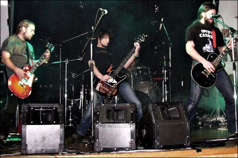 WEED IN THE HEAD ließen von 16.00 bis 16.30 die Zeit still stehen. WITH entstammen den Wäldern des Mittelerzgebirges, der Wiege des ostdeutschen Dooms. Hervorgegangen ist die Gruppe aus der Asche - nein, nicht der eines Joints -, sondern der einer Hardcore-Combo namens Endlösung Schnabeltasse. Chef bei denen war Dreaming-Basser Thomas Schulz, und auch Trommler Tom Krüger überlebte das Projekt. Als Gitarrist Maik Buttler dazustieß, war die Idee vom „Kraut im Kopf“ geboren. Vierter im Bunde ist Sechssaiter André. Wie der Name verrät, frönten Weed den Sinneserweiterungen. Thomas hatte am Vortag mit Dreaming einen Autritt nach alter Schule - heute durfte er seine psychedelische Ader ausleben. Nach langem Umbau entführten uns die Sachsen auf einen Trip vom sonnenwarmen Wüsten- in den kühlen Sternenstaub, in eine Welt aus psychoaktiven Pilzen, wabernden Rauchkräutern und schillernden Farben. Waldschrat Buttler trug den bekifften Stonerrocker „Faster, Faster“ und das hippieske „L.S.D.“ vor. Es folgten zwei von Schulz gesungene Teile: erst das punkige „All Day Long“, dann der von Sons-of-Otis-Einschlägen verzierte „Luciferian Hellride“. Wobei natürlich alle mit Überlänge und Mary Jane bestückt waren. Im Finale hatte wiederum Maik die Ehre, Gott Shiva zu salutieren, und er zelebrierte das stonerige „No. 4“. Gegen die Tollwuetigen aus unserem südlichen Nachbarland war kein Kraut gewachsen, eine blendende Begleitung für den interstellaren Raum waren die Stonerdoomer aus Sachsen jedoch allemal! | ||||||||||||||||||||||||||||||||||||||||||||||||||||||||||||