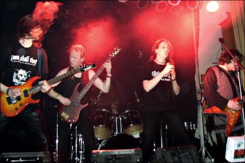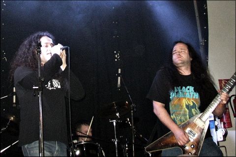 WELL OF SOULS ließen von 20.55 bis 21.40 die Zeit still stehen. Oh, haben die mir leid getan. Schier erdrückend waren die Vorgänger gewesen. Zudem sah es noch vor Monaten nicht gerade rosig aus für die Gruppe aus Ulm. Nach diversen Bäumchen-wechsel-dich-Spielen der Mitglieder - neben Gruppenkopf Frank Hellweg ist nur Sänger Petro Kapakos von Anfang an dabei - war dem angestammten Trommler vorm DSR eine Sehne gerissen. Andy wurde durch Stecker ersetzt. Also das reinste Chaos für die nach einem Lied von Candlemass benannten Doom-Metaller aus dem Ländle. Doch Hellweg ist ein ein Riffhexer von altem Schrot und voll guter Ausstrahlung. Auch Petro hat davon im Überfluß. Zum Auftakt schickte uns mit „Tears of the Proud“ eine energiegeladene Ballade zurück ins Vorvorgestern. Die Hymne „Legion of Doom“ folgte. Und ausgerechnet jetzt ging den Speakern etwas die Luft aus. Schade auch, daß der Jüngling am Bass seltsam versteinert wirkte. Doch Petro headbangte auf Teufel komm raus und powerte mit wundervoller samtiger Stimme das treibende „Evil Sign“ in die Menge. Herr Hellweg hingegen zermorphte geradezu mit seiner Sechssaitigen und ließ die Saiten heulen, daß ganz Triensbach zitterte. In vorderster Linie wirbelten Leute von Thunderstorm und Forsaken ihre Mähnen. Auch ich schickte das Hirn nun endgültig auf die große Reise. Well of Souls zelebrierten den sphärisch schleppenden „Blackened Sky“, sowie das von einem irrwitzigen Gitarrensolo veredelte „Lost My Way“. Düstere Visionen einer vergifteten Umwelt - „Beyond the Void“ - läuteten das Ende ein - in dem uns das schwerelose „Flying“ noch etwas Lebensweisheit auf den Weg gab. Frank hielt eine kurze Weiherede und erinnerte, daß das „Doom Shall Rise von Bands und Fans des Doom für Bands und Fans des Doom“ geschaffen wurde. Er bat, daß „jeder seinem Nachbarn einen donnernden Applaus spenden möge“. Seine Majestät, das haben wir getan! | ||||||||||||||||||||||||||||||||||||||||||||||||||||||||||||