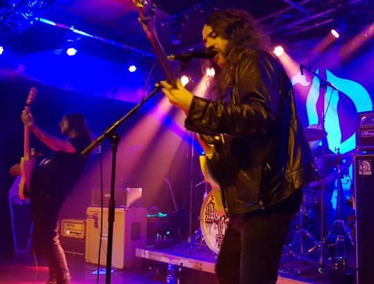 | ACID ROW hatten wir vor zwei Jahren an selber Stelle als Eröffner für die US-Stoner-Doom-Legende Acid King erlebt. Damals hatten mich die Tschechen mit ihrer überschäumenden Energie sehr begeistert. Seither schien Alex Fonar, Dominik Klesa und Radek Bacík der Starruhm etwas zu Kopfe gestiegen. Acid Row kamen heute mit riesigem Backdrop und waren wie eine aufgeblasene Gefühlsachterbahn, die in der einen Sekunde mit einer geradezu nahegehenden Leidenschaft brütenden Doom macht, bevor sie in der nächsten plötzlich kippt und mit heller Fistelstimme platten Heavy Psych Rock schnetzelt. Ein Übermaß an gespielter Lässigkeit und übertriebenen Posen tat das Seine. Die traditionellen Plattmacher - zum einen der Brachialdoomer um den Weißen Hasen „The Emperor“, zum anderen das finstere „On the Edge of the Night“ - versöhnten final. Und dennoch landete die Troika aus Prag heute für mich persönlich in der Abteilung „Gruppen, die die Welt nicht braucht“. | ||||||||||||||||||||||||||||||||||||||||||||||||||||||||||||