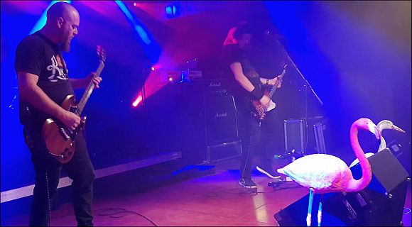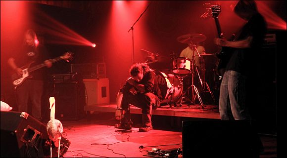 Diesem Konzert hatten wir seit Monaten entgegengefiebert. Dopelord, die Helden des Frühlings, als sie mit Saint Vitus unterwegs waren, doomten im Herbst noch mal für drei Nächte in Deutschland. Eine davon - Elbsludgebooking sei Dank - in Dresden. Dabei kreuzte sich der Weg der Polen mit Warp aus dem Nahen Osten. Zwei Truppen aus Dresden leiteten das Ritual ein. Einhundertfünfzig Zahlende fanden sich ein. Einer davon schlief die ganzen vier Stunden wie ein Murmeltier im Sofa hinterm Mischpult. Ein anderer wollte sich sternhagelvoll auf der Armlehne niederlassen, verschätzte sich jedoch um einen Meter, und legte sich stattdessen später mitten vor die Bühne. Am Bühenrand standen die neuen Maskottchen der „Chemo“: ein weißer und ein rosaer Flamingo. In den Pausen rockten Kyuss vom Band. | ||||||||||||||||||||||||||||||||||||||||||||||||||||||||||||