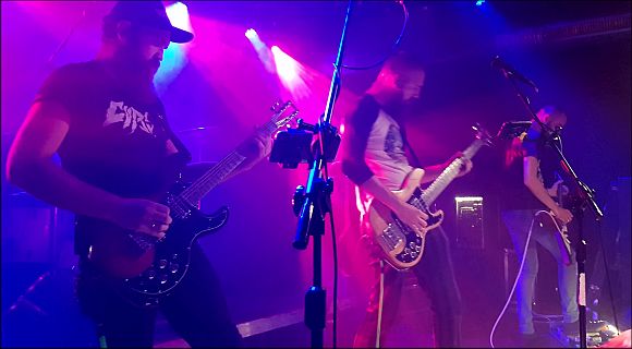 Ohne lange zu fackeln starteten pünktlich um neun die Ersten mit einem „Guten Abend, wir sind DEAD MYRICK aus Dresden“ in die Nacht. Wir sahen drei Typen, die ungleich wirkten - der Frontmann mit verschwitzter Mähne, ein reiferer Sechssaiter mit Glatze und Ziegenbart, der Trommler versteckt unter einer Wollmütze -, deren Stoff aber wie ein bestens geölter Motor lief. Dead Myrick waren absolutes Neuland für mich. Einzig, daß Elbsludgebooker Freedo an den Trommeln saß, war bekannt. Aber Freedo hat viele Bekannte, und die „Chemo“ war rammelvoll von ihnen. Die Freunde der Band kriegten genau das, was sie wollten: geradlinigen, rumpeligen Rock ohne großen Anspruch auf Perfektion aufs Geviert genagelt. Dead Myrick tuckerten durch eine Welt aus Southern Metal, stonerigem Heavy Blues und alten Motörhead. Apropos Motörhead: Voller schelmischem Humor waren Dead Myrick auch. So wurde ein Lied als eins von Motörhead angesagt, wer´s zuerst erriet, bekäme ein Bier... Obwohl der Sänger bei diesem Lied original wie der junge Lemmy klang und auch so aussah: Es war eigenes Material, wie alles von den drei Geistern aus Dresden. Entwaffnend schlichter Rock voller entspannter Gelassenheit und umwerfender Ehrlichkeit. Freedo hatte sich gut geschlagen. Der Einstieg in die Nacht war mehr als gelungen! | ||||||||||||||||||||||||||||||||||||||||||||||||||||||||||||