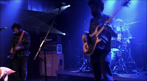 WARP glichen einer okkulten Variante von Dead Myrick. Während Dead Myrick wie in den Achtzigern schnurstraks nach vorn gingen, hielten Warp es eher mit Black Sabbath und den Siebzigern. Gespickt war der Sound von einer unorthodoxen Version von Kyuss´ 'Blues for the Red Sun'. Und: Während bei den Dresdnern der Saal rammelvoll war, spielten Warp nur vor dreißig Augenpaaren. Das Trio zeigte sich jedoch nicht enttäuscht und lieferte eine halbe Stunde voller Hingabe ab. Warp waren zwar keine Revolution, zur Untermalung eines Getränks vorm nahen Höhepunkt der Nacht aber allemal gut genug. Wirkliches Manko blieb der krude Akzent ihres Englisch, den wohl keiner verstand. Daß in dem Auftritt Herzblut steckte, zeigte sich auch am Fronter, der die anderen Gruppen interessiert hinterm Mischpult verfolgte, und der ein Shirt gegen die Kriege auf unserer Welt trug. | ||||||||||||||||||||||||||||||||||||||||||||||||||||||||||||