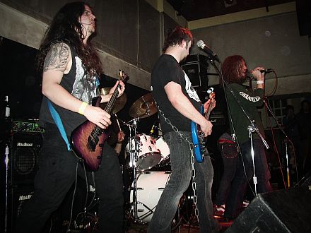 | 21.35 Uhr standen ODIUM auf der Rampe. Odium? Wer sind die? Dabei existierte der Fünfer aus Südosthessen schon seit zehn Jahren. Stellte sich die Frage: Was haben die die ganze Zeit getrieben? Und welche Musik machen die? „All is Bleeding“ brachte Licht ins Dunkel: Rochus, Reinhard, David, Christoph und Tobias machten Power Thrash im Achtziger-Stil und weckten Exodus, Overkill und Testament zum Leben. „Chaotic“ untermauerte es. Der Fronter erinnerte mich etwas an einen gewissen Flo von Broken. Sprich: Reinhard sang, schrie und peitschte unter großer Hingabe. (Für alle, die Flow kennen: Er lebt und es geht ihm ganz gut!) Die Meute fand den etwas freigeistigen Gesang weniger packend: Vor der Bühne klaffte ein Loch - das Reinhard für ausgiebiges Headbanging und Niederknieaktionen nutzte, und um bei „A New Beginning“ ein Mädel aus dem Publikum in den Schwitzkasten zu nehmen. Seine Gefährten wirkten unterdes lethargischer. Der Bassist meckerte über die Hitze - und erntete ein hämisches „Applaus für Christoph! Er schwitzt“ Derweil sich Reinhard seines Pullis entledigte, um fortan in geilem Toranaga-Shirt übers Geviert zu tigern. „At the Tomb“ und das vehemente „Bé:Orscype“ fackelten durch die Speaker. Gerre erzählte mir seinen Traum der letzten Nacht, einen vom Krieg im Irak. Und Odium droschen die rasende Granate „Written in Flesh“ und das progressive „Searching for the Exit“ in die Meute. Viel entfesselter als zu Beginn, und trotzdem wirkte alles etwas sperrig und mitunter schwer verdaulich. Ich fand Odium kultig, aber auch anstrengend. Die schnurstracks auf die Zwölf gehenden „Swallow“ und „Beast by Society“ machten Lust auf mehr. Und wer spielt im Vorprogramm schon eine volle Stunde? Währenddem plapperte ich mit Andi von Tankard. Vor uns headbangte ein Turban-Sikh in Pro-Pain-Shirt... | ||||||||||||||||||||||||||||||||||||||||||||||||||||||||||||