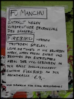 Stoner Rock sollte heute zelebriert werden. Kaliforniens Wüstenfüchse Fu Manchu sollten uns nach den „The Action Is Go“- und „King Of The Road“-Tourneen auf dem Sommerfeldzug zum hundertminütigen Liveorgasmus 'Go For It!' ein drittesmal mit staubtrockenem Fuzzrock verzaubern. Der weite Weg nach Wiesbaden konnte Peanut und mich nicht schrecken. Bei sengender Hitze liefen wir um neun auf der Brache des ehemaligen Schlachthofs ein, und standen nach Austreten am Wasserturm dann tatsächlich vor dem zum graffitibeschmierten Kulturzentrum mutierten Kernbau. Aber was war das?... ...ein handgeschriebener Zettel an der Tür: Absage!!! Scott Hill, der Frontmann von FU MANCHU, war erkrankt. Kurzfristig. Fieberschauer, wie zu vernehmen war. Aber der „Special guest“ sollte auftreten. Abzüglich Vorverkaufsgebühr gab´s 14 Euro pro Eintrittkarte zurück - und für vier Piepen die Gruppe Firebird solo. 2000 Menschen faßt der „Schlachter“. Die Suicidal Tendencies hatten ihn 1998 ohne Rücksicht auf Verluste bis zum Bersten gefüllt. Heute war die Große Halle mit einem schweren Vorhang halbiert. Im restlichen Salon tummelten sich rund 150 Leute. Ich probierte das Modebier „Becks Gold“ - und traf den schnellen Marathonläufer Tim L., der mir von den Rennschlachten in Frankfurt und Mainz bekannt war. Heute redeten wir in artfremdem Revier unter Pausenberieselung von AC/DC. | ||||||||||||||||||||||||||||||||||||||||||||||||||||||||||||