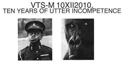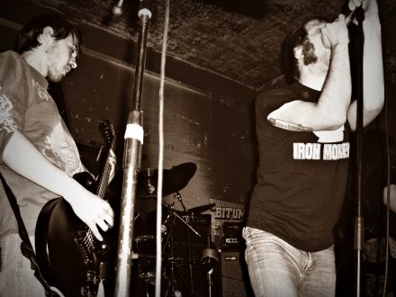 Zur Jahrtausendwende hatten Vokalist Breuer, Schlagzeuger Pürschel und Gitarrist Trautwein die Gruppe mit dem änigmatischen Namen gegründet. Für die Aufnahmen zur ersten Schallrille 'Audibly Bleeding' stieß mit Gitarrist Satt ein vierter Mann dazu, und Trautwein übernahm den Baß - bevor schließlich über die Freundesclique mit Sturmkind Partheymüller auch noch ein zweiter Gitarrist in den Kader rückte. Nach einigen Querelen schied Trautwein im achten Jahr aus und wurde durch Alexander R. ersetzt. Soweit der Abriß zur Vergangenheit. Heute durften VERSUS THE STILLBORN-MINDED die Beastie Boys der Nacht sein. Zehn Jahre Kiffen, Kotzen, Kopulieren und Krachmachen! Zehn Jahre äußerster Inkompetenz. Zehn Jahre perverse Spiele auf den Bühnen der Erde. Wenn das kein Grund zum Feiern ist... Völlig in Bordellrot getaucht war die Bühne ab 23 Uhr 40, als die Sonderschau mit einer analen Entblößung und „Climax of Delusion“ begann. Der Mann mit der Reibeisenstimme nahm die zentrale Position hinterm Mikro ein, und auch ich war nun in den ersten Sturm verdonnert. Dort faltete mir eins der Mitglieder einen Joint. Der Name bleibt geheim. Bekannt ist allerdings, daß Blackblood und Doomvolki auch daran ziehen durften... Bei Versus selbst war alles beim Alten: Doomige Apparaturen, hardcorige Vokale und eine Attitüde zwischen Unsinn und Beklemmung, Witz und Wahn, vereinten sich zum alles niedertrümmernden Psychope Sludge Doom. Unter vollem Prozessionsbeschuß zelebrierten Versus heute ferner viel Drone-Gedröhn - bevor man im Schlußakt mit „Out of Hand“ Entombed huldigte. Nach Einnahme diverser Hausmittelchen duellierte sich final nicht nur der neue Bassist mit den Kollegen, sondern auch der Mann mit dem schwarzen Bowlerhut durfte noch mal auf die Planken - um mit Boris ein zweitesmal „Out of Hand“ rauszuschrein. Nachdem Mitternacht viele zur letzten Bahn mußten, nachdem die alkoholischen Entartungen überhand nahmen, und nachdem Kalle auch noch fremdes Erbrochenes wegwischen mußte, klagte auch Boris irgendwann über Übelkeit. Sturmkind hätte „alles gespielt“, wie er mir sagte, doch der Chef machte um 1.16 Uhr kurzen Prozeß. Nachdem er schon vorm Auftritt wie ein Halm im Wind schwankte, plumpste der Bassist mit dem Aufdrehen des Lichts wie vom Blitz getroffen ins Schlagzeug... „Performanz, nennt man das!“ Der das äußerte, war bis 2008 der Bassist von Versus gewesen, und demonstrativ erst nach dem Auftritt der Verflossenen in den Kunstverein gekommen. Um 1.45 Uhr habe ich das letzte Bier bestellt. Ich durfte noch etwas mit Festivalmacher Sebastian sinnieren, der im Abspann als Plattenaufleger in Aktion trat. Kurz vor zwei Uhr sind wir weg. - - In der Unterkunft angelangt, saß dort jemand schnarchend auf dem Etagenklo. Als ich kurz vor drei Uhr das letztemal pinkeln war, war der Abort frei. Dafür lag ein Flugblatt vom „Monsters of Närmberch“ daneben... >> Fortführung ... LFA VII, TAG 2 << Doom, Fascination und Gewalt: ((((((Heiliger Vitus)))))), 22. Dezember 2010 | ||||||||||||||||||||||||||||||||||||||||||||||||||||||||||||