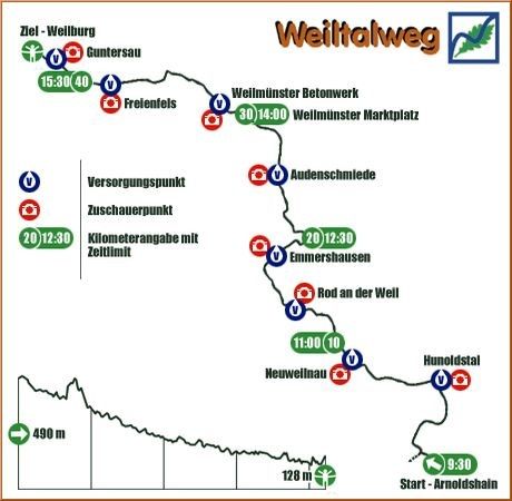 | Der Weiltalweg-Marathon ist wie ein reizvoller Streifzug durch die Natur vom Mittelgebirge über Feld und Wiesen, Wälder und Bäche bis in die Stadt. Dabei ist der Taunus gewiss nicht flach. Der Weg führte vom Hochtaunusdorf Arnoldshain auf einer Höhe von 477 Meter über N.N. durch den Hintertaunus mit den Ortschaften Neuweilnau, Rod an der Weil und Emmershausen zur ehemaligen Residenzstadt Weilburg an der Lahn auf 134 Meter über Meereshöhe. Stimmungshöhepunkt war die Passage durch die malerische Altstadt von Weilmünster. Das Geläuf erwies sich als stabil, in einem Wechsel aus Straße, Wald- und Wanderwegen und der stillgelegten Bahnstrecke der Weiltalbahn. Bis zum 25. Kilometer standen einige Anstiege im Weg. Bis Kilometer 30 waren es 14 mit je mehr als 20 Höhenmetern, der schwerste davon - die Treisberg-Serpentine - einen Kilometer lang mit 75 Höhenmetern. Am Ende aber war es sogar leicht abschüssig. Insgesamt ging es 827 Meter hinauf und 1162 Meter hinab. | ||||||||||||||||||||||||||||||||||||||||||||||||||||||||||||