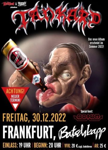 | Jeder Auftritt von Tankard vor heimischem Publikum ist ein Frankfurter Kulttermin. Er gehört zum Inventar wie das Rippeglas und der Bembel zum Äppler. Der diesjährige war ein Nachholtermin für den 18.9.20 und den 24.9.21, als er laut Frontmann Gerre „vierundsiebzig Mal verschoben“ wurde. Zwei Jahre vor der Seuche hatten wir Tankard zusammen mit Holy Moses am selben Ort erlebt. Danach waren Tankard für mich eigentlich durch. Eigentlich... Aber Tankard sind Helden der eigenen Sturmzeit, Erinnerungen, Heimat, was Spezielles. Dazu riß mich das diesjährige Ritual aus einer isolierten Tristesse, die ich seit geraumer Zeit führe... Pünktlich um acht traf ich mit meinem Mädel im Gewerbegebiet Seckbach ein. Vor der Batschkapp erwartete uns eine Schlange, die im Regen um Einlaß begehrte. Zur Gutmachung wurden drin die Komputerkarten in stilvolle Hardtickets umgetauscht. Und zwar in die Originale der 'Beerbarians On The Warpath'-Tour aus dem Jahre 2020. Wir bekamen die Schnapszahl 1199 und die runde 1200. Auch der gut in Schuß wirkende Tankard-Manager Buffo himmelte uns mit grauseidenem Pferdeschwanz an. Unerfreulich indes das Publikum. In der Halle tummelte sich eine rund anderthalbtausendköpfige Gruselsippe vom Proll über Schreckschrauben und Fußballfans in „Forza SGE!“- und „So sehen Sieger aus!“-Shirts, bis hin zu mit Charterbussen angereisten Eintracht-Fanclubs, die Silvester ihre Vereinskasse leersoffen. Metalheads erblickte ich nur wenige, nicht einen aus alten Zeiten. Nachdem wir in den „Öffis“ fortlaufend an die Pflicht zum Tragen eines Maulkorbs erinnert wurden, standen wir nun zwischen vielen Gestalten ohne Regeln und Manieren auf engstem Raum - und kamen trotzdem heil heraus. Es läuft gerade furchtbar viel verkehrt... | ||||||||||||||||||||||||||||||||||||||||||||||||||||||||||||