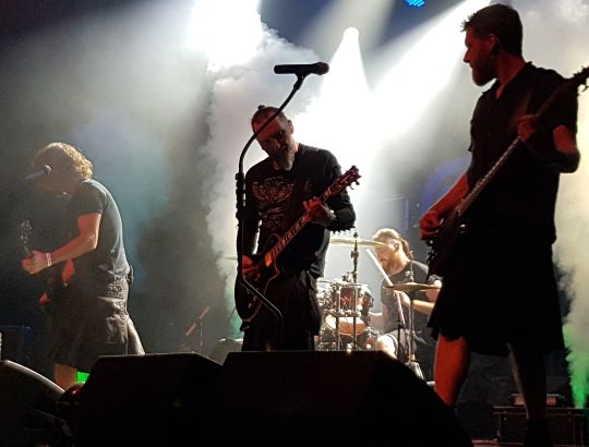 | Trotz unheiliger Witterung waren PERTNESS aus dem über vierhundert Kilometer entfernten Berner Oberland angereist - und hatten ihren Anhängern für den Weg aus den Schweizer Alpen ins Herz Deutschlands sogar einen Fanbus mit minimum neun Einstiegsorten klargemacht. „Hallo zusammen, wir sind Pertness aus der Schweiz!“, lautete die Vorstellung vorm zweiten Lied „Cold Wind of Death“. Auch bei Pertness handelte es sich um Urgesteine. Allerdings waren mit Vokalist Schluchter und Sechssaiter Zurbrügg nur noch zwei vom Gründungsjahr 1993 an Bord. Wie schon die Finnen rochierten auch die skurille Zöpfe und schwarze Röcke tragenden Eidgenossen wild übers Podest. Vier Rauchsäulen stiegen aus dem Boden empor. „Swiss Highland Metal“ titulierten sie ihren wuchtigen, mittelschnellen Power Metal mit Folk-Flair. Pertness kamen mit viel Herz und Aufwand, aber kaum neuen Ideen als Tankards „Freunde aus der Schweiz“. Das berühmte „Wer hat´s erfunden?“ galt für sie nicht. Locker nebenher geguckt werden konnte die „Keckheit“ jedoch allemal. Nach einer Dreiviertelstunde und „Frozen Time“ war Sense. | ||||||||||||||||||||||||||||||||||||||||||||||||||||||||||||