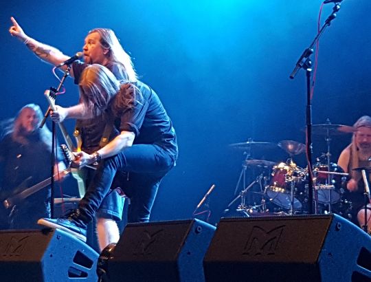 | Am satten Klang der Kapp durften sich zuerst die von Gerre als „finnische Legende“ geadelten PRESTIGE berauschen. Prestige hatten sich 1987 gegründet, allerdings Anfang der Neunziger aufgelöst, und erst nach mehr als einem Dutzend Jahren neu formiert. Doch mit den Brüdern Karppinen, Vokalist Kytölä und Rhythmusgitarrist Yrlund stand die Urbesetzung vor uns - vier gefestigte Männer in schwarzer Kluft und mit Bärten und blonden Haaren bis zum Arsch. Jene entpuppten sich als wunderbar gespielte Speed-Thrash-Geschichte mit nostalgischem Zeitkolorit und dem kauzigen, dunklen Flair ihrer finnischen Heimat. Die ganz große Oper waren die Suomis vielleicht nicht, aber mit ihrem einfachen, raserischen Metal, schon fast vergessenen kurzen, schnellen Liedern kaum über drei Minuten, und einer Überdosis Testosteron, unterhielten Prestige blendend. „Whats is the most important word in our finnish language?“ frug Kytölä - um sie selbst mit einem sechsmaligen „Perkele!, Perkele!, Perkele!, Perkele!, Perkele!, Perkele!“ zu beantworten. Der TEUFEL führte gewissermaßen das Kommando - und „Punishment“ den letzten Hieb! | ||||||||||||||||||||||||||||||||||||||||||||||||||||||||||||