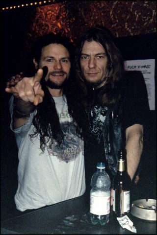 Ein schwieriges Unterfangen für THE ATOMIC BITCHWAX. „Awesome exploding Wah Wah pedal 70´s space rock feat. Ed Mundell from MONSTER MAGNET“ vermeldete ein Aufkleber auf deren Neuwerk 'Spit Blood'. Treibende Kraft bei den Space-Boogie-Rockern aus New Jersey war neben dem erwähnten Monster-Magnet-Sechssaiter der frühere Godspeed-Bassist und Sänger Chris Kosnik. Komplettiert wurde der Trupp durch Schlagzeuger Keith Ackerman. Gesang gab´s nur marginal. Der zentral agierende Mundell glänzte als langhaariger Schlaghosengockel und selbstverliebter Riffvirtuose - sein Rockstargehabe stank. Bei „Liquor Queen“, „Cold Day in Hell“ und „Spit Blood“ wurde ganz auf Gesang verzichtet, Titel wie „Get Your Gear“ erfuhren nur vereinzelte Auflockerung durch Kosniks Bluesröhre. Im Übrigen herrschte das Gefrickel von Mister von und zu Mundell. Bei AC/DC haben sie geplündert: „Dirty Deeds Done Dirt Cheap“. Ansonsten waren The Atomic Bitchwax eine Soloschau mit Nebenfiguren. Sie fanden wenig Anklang... - Zwei Tage später führte die Tour in die Dresdner „Scheune“. Nach dem Konzert zogen drei Langhaarige um den Spacelord mit geschulterten Gitarren an der Metalkneipe „Heavy Duty“ vorbei. Sprich: Harte Kerle, die dort Station machen müssten. Pustekuchen! Dies nur am Rande, jedoch aus absolut sicherer Quelle, und auch eine Meinung zu echten Rockern. Den Anfang machten heute aber TERRA FIRMA. Leider stand deren Ritual unter einem schlechten Stern: Chritus war erkältet und litt unter Stimmproblemen. Doch Terra Firma zogen ihr Ding durch. 1999 hatte ich sie vor Cathedral und Orange Goblin auf der „Cosmic Caravan“-Tour erlebt. Die Schweden sind weg vom progressiven Doom Rock, den sie damals zelebrierten. Ihr Zweitling 'Harms Way' huldigt eher dem Heavy Rock. Vielleicht als Zugeständnis an den Geist der Zeit? Egal! Die Männer aus Stockholm hatten die Planken erklommen und ließen nun die Röhrenverstärker brennen. Freddies Gitarre dröhnte lässig und schwer; die langhaarigen Moosebeach und Izmo Ledderfejs an Bass und Trommeln sorgten für tiefen Bums; und Chritus, der vom irdischen Sein ausgemergelte Schlaks, lebte die harten Klänge mit eindringlichen Gefühlen. Immer wieder sank er im Klagegesang ekstatisch in sich zusammen, kniete im Staub, raffte sich auf, zerrte an seinem Shirt als wolle er sich das Herz aus der Brust reißen... und dann schimmerte diese atemraubende, beschwörende Magie des Doom durch... Funkenflug! Wahnsinn! Mit dem Nackenbrecher „Dust Parade“ schraubten die Schweden die Geschwindigkeit hoch, der heavy Triprocker „Groundman“ verwirbelte die Umwelt, und das angedoomte „The 8th Seal“ ließ mein Endorphin endgültig überschwappen und die Sinne ins Irgendwo fliegen. Schamesröte dürfte mich überzogen haben, als Chritus mit einem Fingerzeig das letzte Lied ausgerechnet mir widmete: das metallisch angehauchte „Steel Scale“! Im Anschluß schenkte ich Chritus einen silbernen Ring, der revanchierte sich mit einem Langärmer aus seinem Privatarsenal, und wir tranken zusammen Bier. Von manchen Menschen möchte man sich nie, nie mehr trennen! Das waren sie, die ganz großen Gefühle, die Zeit blieb kurz stehen und meinetwegen hätte die Welt untergehen können. *seufz und schluchz* Es bleibt die Erinnerung. Noch am Tag nach dem Konzert haftete Chritus´ Geruch an mir. Und es fiel mir unsagbar schwer, ihn abzuwaschen. Seit dem zweiten Dezember 2001 weiß ich, daß auf dem kalten Planeten ein Seelenverwandter existiert: Lord Chritus! Heiliger Vitus, im Dezember 2001; Bild von Vitus & Lord Chritus - für die Ewigkeit: Peanut | ||||||||||||||||||||||||||||||||||||||||||||||||||||||||||||