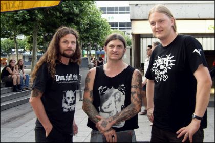 Halb elf ging die Sonne auf - Wino trat ins Licht! Vor zwei Wochen von 25 000 Fans angehimmelt, wollten heute 66 die Seele des Doom sehen... Wino nahm´s gelassen und lächelte ein verschmitztes „es sei heiß wie in Los Angeles“ in die Runde. Seine Mitstreiter hießen Bruce Falkinburg und Dave Hennessy. Der Langmähnige, der wie ein Schamane aus anderen Zeiten wirkt, und zwei Grünhörner in alternativer Aufmachung. Optisch grundverschieden, aber dennoch ein Team. Treu dem Buch „The Secret World Government or THE HIDDEN HAND“, in dem es um die heimlichen Lenker der Weltengeschicke geht, spickten die drei ihren Doom Rock mit sozialem Sprengstoff. Feuer frei für Album Nummer eins: 'Divine Propaganda'! Gleich das eindringliche „Falconstone“ jagte mir die Gänsehaut nur so übers Kreuz. Egal was Wino tut: es sprüht vor Leidenschaft und Hingabe. Vom orgiastisch groovenden „Tranquility Base“ an, war nur noch Durchdrehen angesagt. So delirierten die Jungs von Tollwuet mit mir einträchtig an der Front zum zornigen „Bellicios Rhetoric“ einen Veitstanz. Die Fragen um „Damyata“ ließen unsere Köpfe rütteln. Darauf gleich der nächste Anstachler - durch das punkige „Screw the Naysayers“... Jetzt war es Zeit, was zu ändern: „Sunblood“ schickte uns zurück in kauzige Obsessed-Zeiten. Darauf schlängelte sich eine sehr psychedelische Instrumentalnummer aus den Speakern. Beim „Last Tree“ hingegen durften wir in stonerigem Gefilde wandeln. Bis das fast schon speedmetallische „The Hidden Hand“ gleich darauf wieder zu umso wilderem Bangen antrieb. Nach kurzem Verschnaufen ließ Wino seine Sechssaitige noch einmal surren. Nun improvisierten Hidden Hand sagenhafte fünfundzwanzig Minuten lang „De-Sensitized“ und das giftige „Divine Propaganda“. Nach siebzig Minuten war es endgültig vorbei. Und zwar knackig, kritisch, magisch und faszinierend! Ich ließ alles wirken und hoffte auf eine Zusammenkunft mit Wino. Und Wino erschien - umarmte und herzte mich völlig erschöpft und innig. Klitschnaß ließ ich mir in dem keilförmigen Kabuff gleich neben der Bühne - auch „Künstlergarderobe“ genannt - ein zweites Tattoo skizzieren. Auf feuchter Haut ein Problem. Wino bat seine Crew um Handtücher, Filzstifte, Kugelschreiber... Scheinbar hatte er spitzgekriegt, daß wir in Eile wegen der Heimfahrt waren. Sorgenvoll frug er Peanut: „You have to catch your train? You can´t come back later?“ Nun war uns alles egal. Nach dem Full Force lernten wir Wino erneut als großartigen Menschen kennen, als stilles, schlichtes Geschöpf. Diese Momente sind in unseren Gehirnen. Ich hätte nur noch weinen können. - Noch lange nach der Schau saßen wir mit Roger und Greili bei „Ebbelwei“ an der halbrunden Bar im Café. Auch die Doombrüder aus der Schweiz waren Wahnsinn. Um zwei traten wir per Droschke den Heimweg durchs nächtliche Frankfurt an. | ||||||||||||||||||||||||||||||||||||||||||||||||||||||||||||