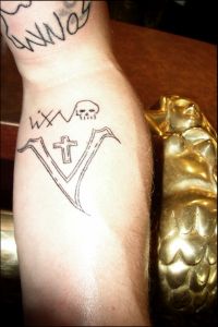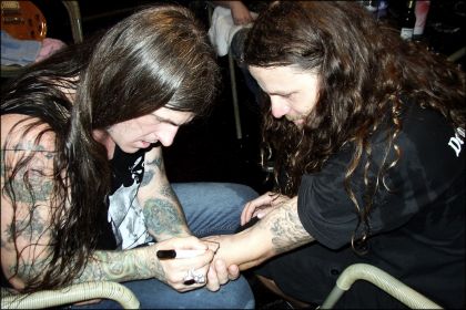 Nachhall Zwei Tage später fräste Witschas uns im Dresdner Tätowierstudio „Sweet Needles“ die Unterschrift von Wino und das Vitus-´V` unter die Haut. Heiliger Vitus im Juli 2003; Bilder: Vitus & Peanut | ||||||||||||||||||||||||||||||||||||||||||||||||||||||||||||